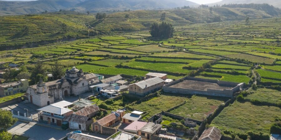 Calles pequeñas, casas de adobe o sillar y comercios locales que conservan la esencia de un pueblo arequipeño antiguo.