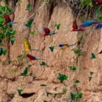 La Collpa de Guacamayos Colorado en Tambopata es uno de los escenarios más impresionantes de la selva peruana. Cada amanecer, cientos de loros, pericos y guacamayos llegan a un gran muro de arcilla para alimentarse de minerales. El cielo se llena de rojo, azul, verde y amarillo mientras las aves vuelan, gritan y se acomodan en la pared. El resultado es un espectáculo natural único, perfecto para viajeros que aman la naturaleza y buscan una experiencia auténtica en la Amazonía.