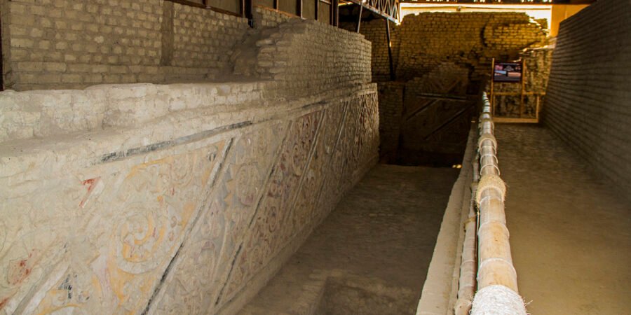 Este es el punto central del recorrido. Sus terrazas superpuestas son impresionantes y los murales policromos ofrecen una visión clara del universo mochica. Los relieves muestran guerreros con tocados elaborados, prisioneros atados, sacerdotes con capas ceremoniales y seres sobrenaturales vinculados al poder y la fertilidad. La escena del “Degollador”, uno de los motivos más reconocidos del arte mochica, aparece repetidamente en distintos muros.