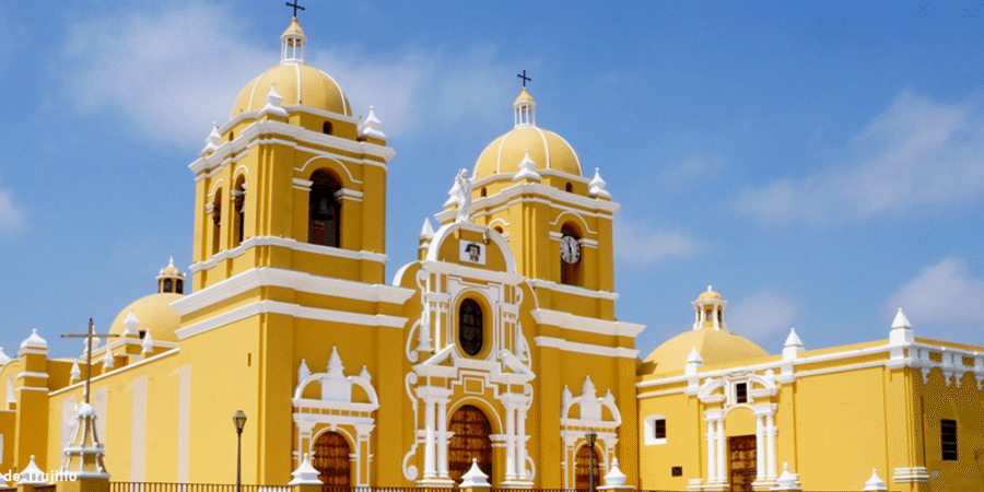La Catedral de Trujillo está situada frente a la plaza y resalta por su color amarillo intenso, que contrasta con el cielo y las palmeras. Su construcción original data de 1647 y ha sido restaurada varias veces debido a movimientos sísmicos. El interior conserva retablos barrocos y neoclásicos, así como pinturas de la escuela cusqueña. Es uno de los templos católicos más importantes del norte peruano y un atractivo obligatorio para quien visita la plaza.