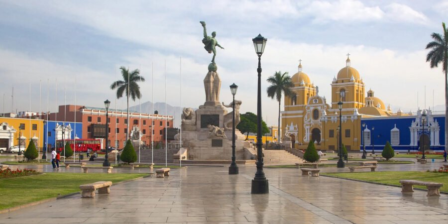 La Plaza de Armas de Trujillo, también llamada Plaza Mayor de Trujillo, es el corazón histórico de la ciudad y uno de los espacios urbanos más bellos y representativos del norte peruano. Aquí empezó la historia colonial de Trujillo, se proclamó su independencia y se construyó el escenario donde nobles, comerciantes, autoridades y viajeros moldearon la identidad cultural de la región. Hoy es un lugar amplio, elegante y lleno de carácter, rodeado de casonas virreinales pintadas en tonos intensos, balcones tradicionales, iglesias, jardines cuidados y el imponente Monumento a la Libertad, que domina el centro y le da una personalidad única. Caminar por la plaza es adentrarse en un espacio que combina memoria, arquitectura, tradición y vida cotidiana.