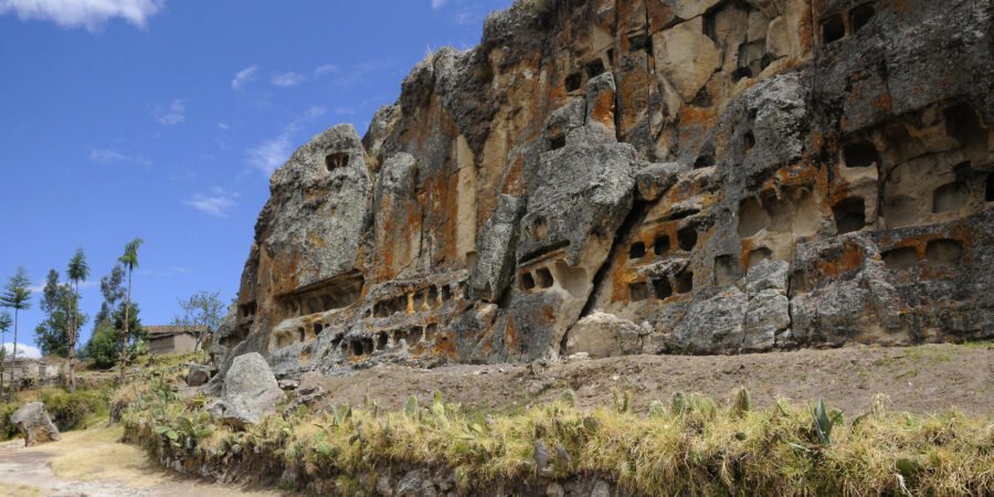 Las Ventanillas de Combayo son un conjunto de nichos funerarios de origen preinca que se extienden a lo largo de formaciones rocosas en medio de un valle agrícola. Sus cavidades, talladas cuidadosamente en la roca volcánica, se asemejan a pequeñas ventanas que dan la impresión de un antiguo edificio multiforme adherido a la montaña. Es esta apariencia singular la que les da el nombre de “ventanillas”. Al llegar, el visitante encuentra un entorno donde la historia arqueológica convive con la vida campesina, las terrazas de cultivo, el aroma a leña y el sonido del viento que recorre los cerros.